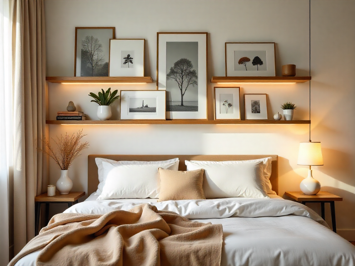 3. Prateleiras Flutuantes: Utilize prateleiras flutuantes para exibir as fotos, criando uma galeria moderna e versátil.